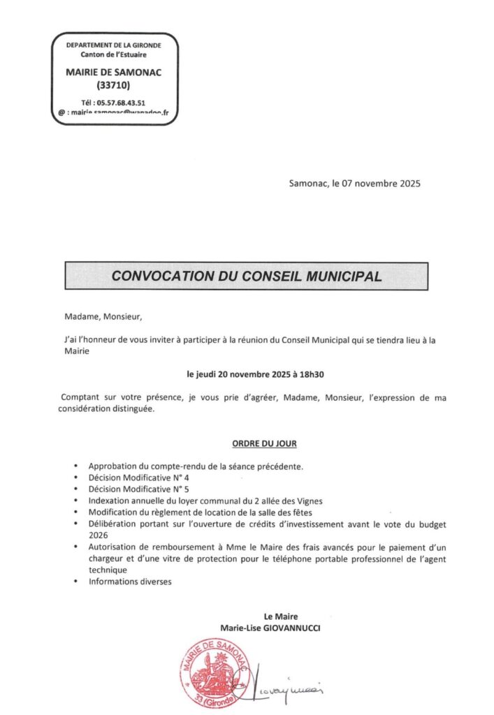 Je vous remercie de trouver ci-dessous la convocation pour le prochain conseil municipal qui aura lieu le 20 novembre 2025.